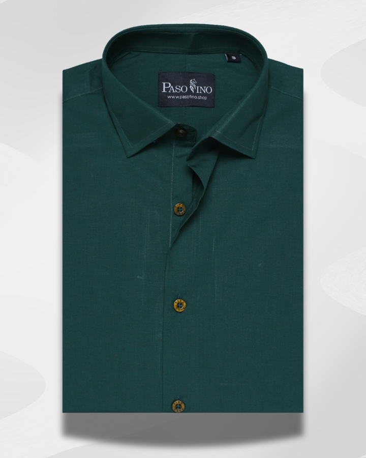 Bold yet refined, the Emerald Classic Cotton Shirt brings a refreshing touch of sophistication to your wardrobe. Crafted from premium cotton, it offers a smooth texture with breathable comfort, making it perfect for all-day wear. The deep green tone exudes confidence and versatility, while the engraved PASO FINO buttons and sharp collar enhance its premium appeal. A perfect choice for both formal and semi-formal occasions.