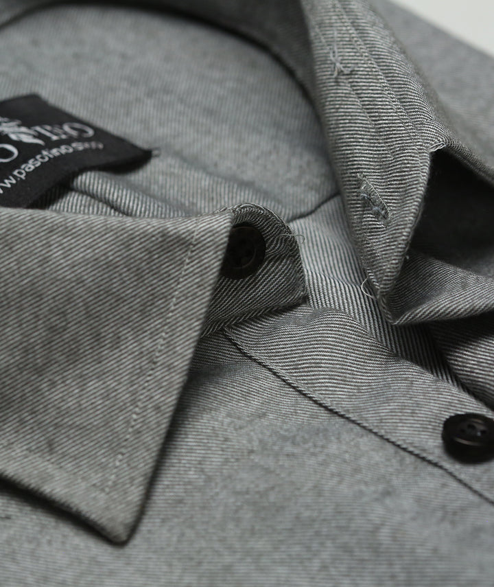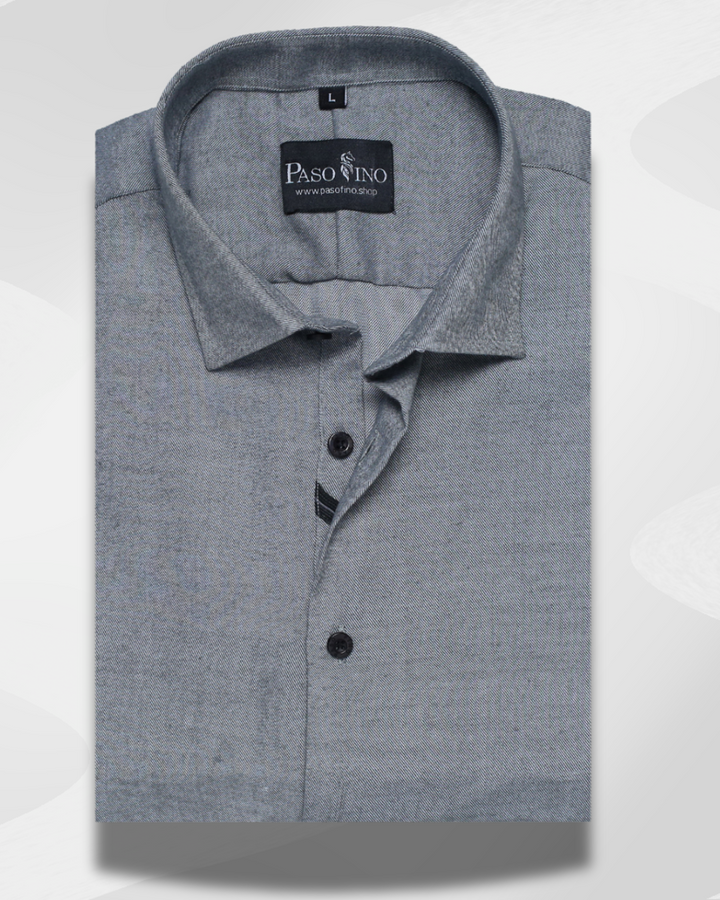 Refined and versatile, the Steel Grey Twill Shirt is crafted from premium cotton-blend fabric with a subtle twill weave that adds depth and character. The shirt features a sharp collar, engraved PASO FINO buttons, and a modern tailored fit designed for all-day comfort. Its understated grey tone makes it a timeless choice for both business meetings and smart casual outings.