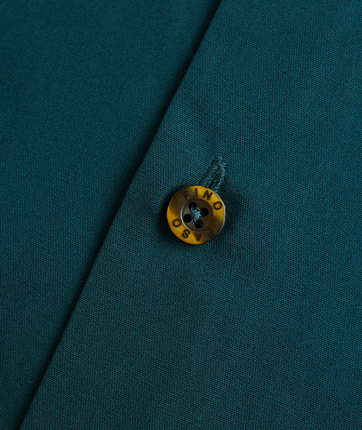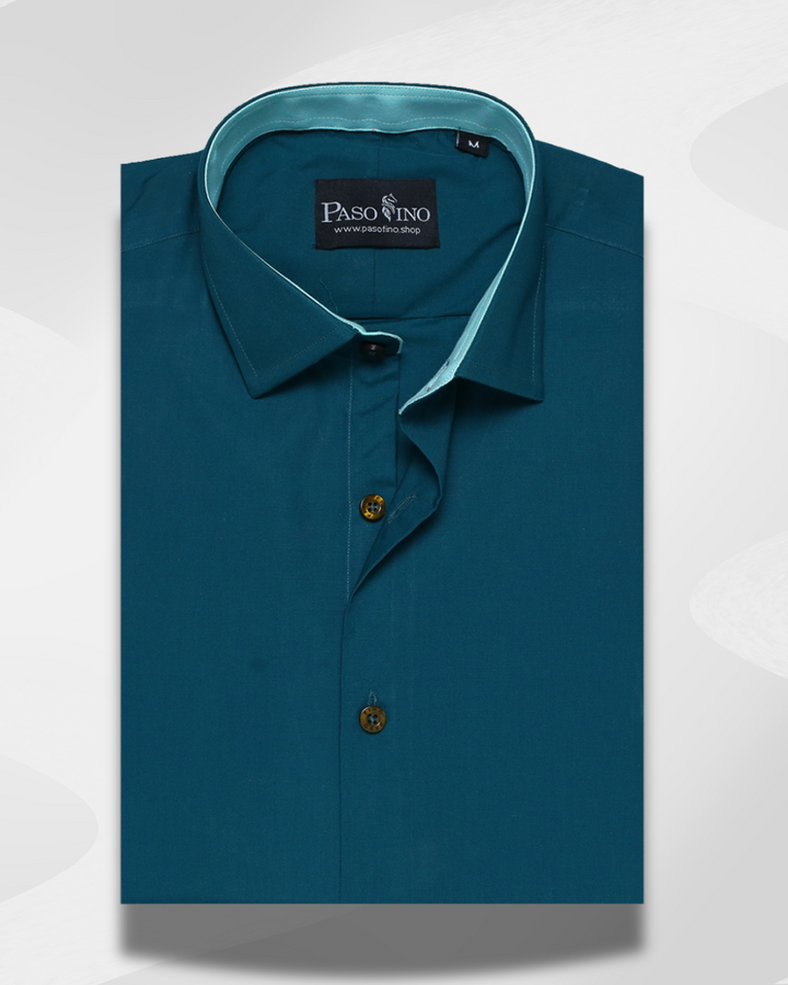 Modern and distinctive, the Teal Contrast Collar Cotton Shirt is designed to set you apart with subtle detailing and timeless style. Crafted from premium cotton fabric, it offers breathable comfort and a sleek finish. The rich teal base is complemented by a light aqua contrast inner collar, adding a refined edge to the overall look. Engraved PASO FINO buttons complete the premium detailing, making it perfect for both office wear and semi-formal occasions.